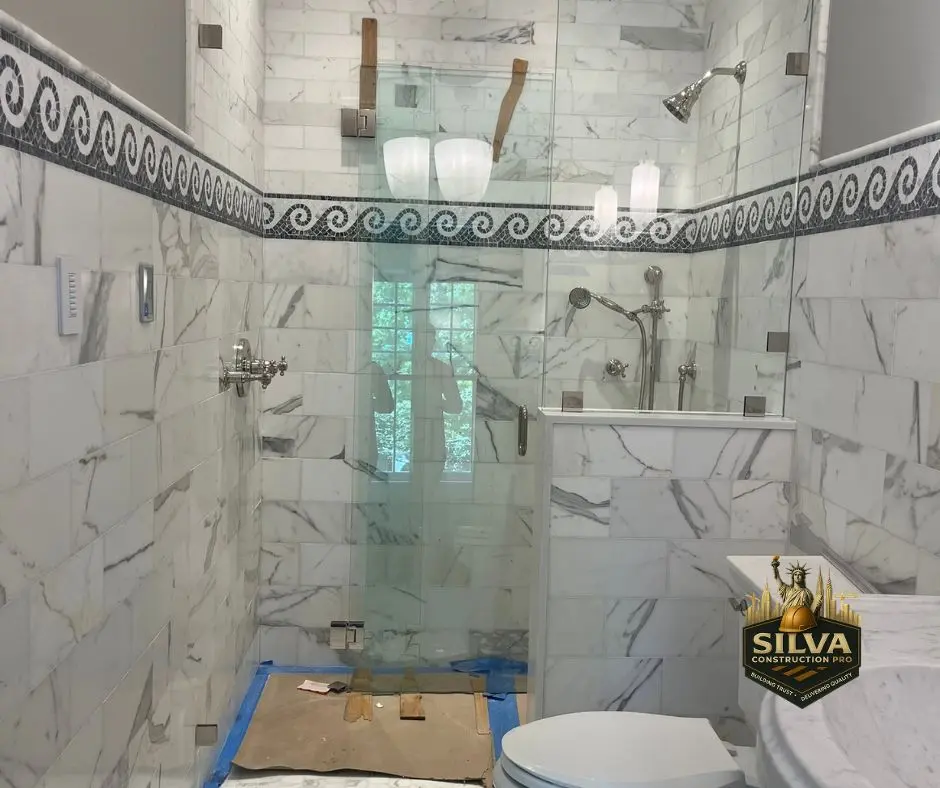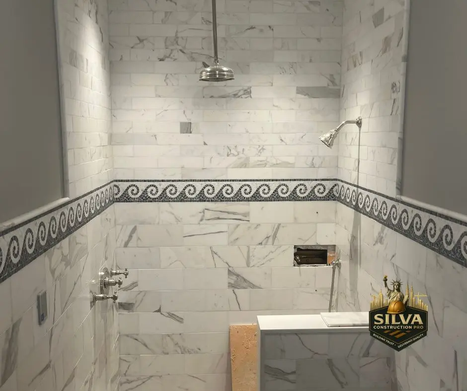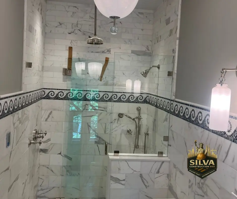 An exquisite bathroom renovation showcasing high-end marble tile work with a custom decorative mosaic border. This project demonstrates Silva Construction Pro's expertise in luxury bathroom installations, featuring elegant white marble tile with natural gray veining throughout the walls and ceiling. The standout feature is a stunning hand-laid mosaic border with an intricate Greek wave pattern in black and white, creating a sophisticated visual accent that wraps around the entire room. Premium polished nickel fixtures, a frameless glass shower enclosure, and a vintage-inspired rainfall showerhead complete this spa-like retreat. The attention to detail and precision tile work showcase true master craftsmanship.