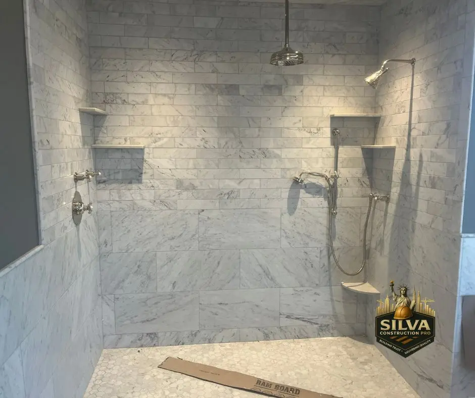 An elegant walk-in shower featuring premium white Carrara marble tile throughout and a sophisticated dual shower system. This project showcases expert marble installation with horizontal brick-lay pattern that highlights the natural gray veining and creates a spa-like atmosphere. The spacious design includes two complete shower systems—a ceiling-mounted rainfall showerhead and a wall-mounted traditional showerhead with handheld option—perfect for couples or those who want flexibility. Multiple recessed niches provide ample storage for toiletries, and the polished chrome fixtures complement the marble's classic elegance. The floor-to-ceiling tile installation, including the ceiling, ensures complete water protection while creating a luxurious, cohesive look.